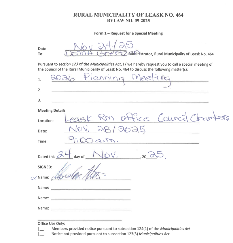 The regular council meeting will be held at the R.M. of Leask Office 231 1st Avenue South, Village of Leask
