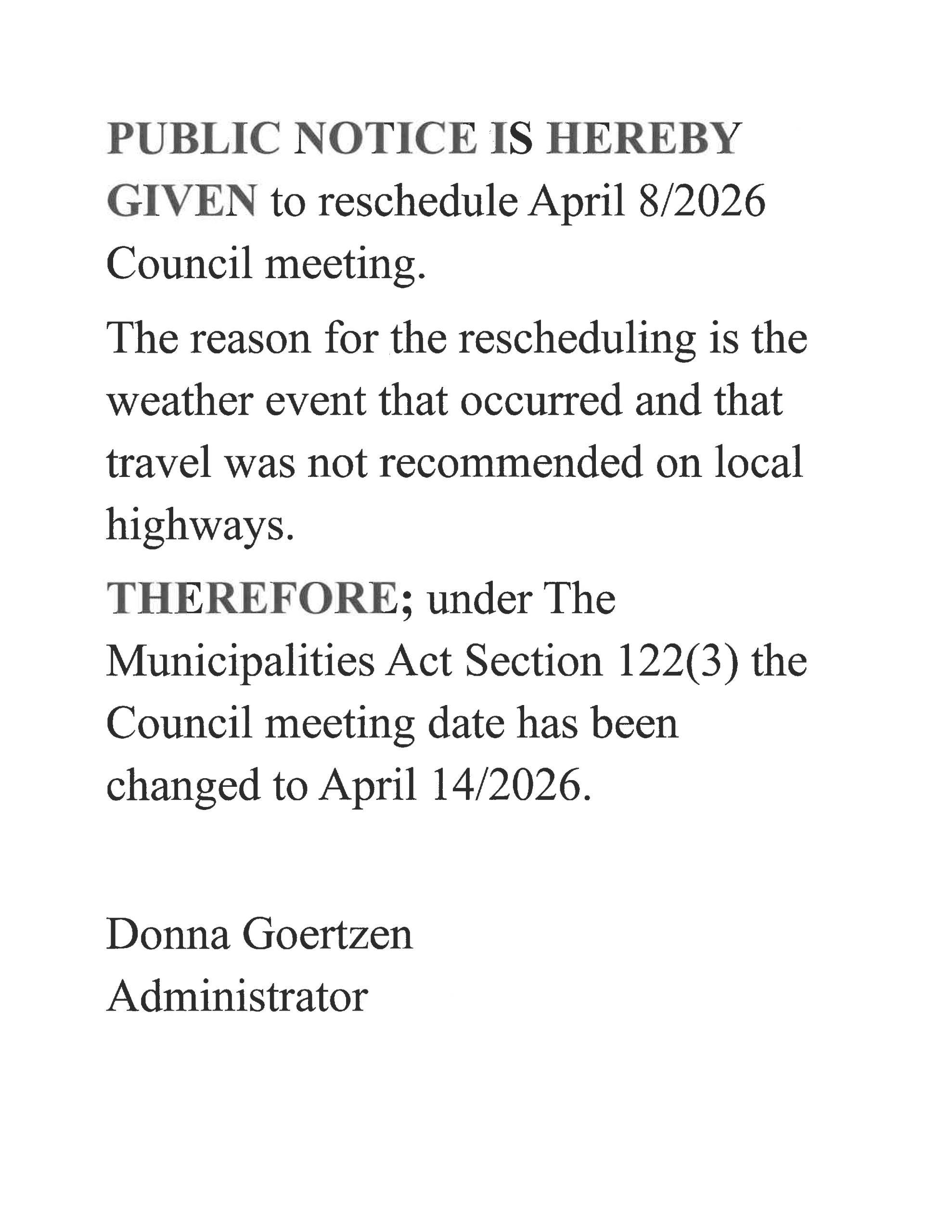 The regular council meeting will be held
